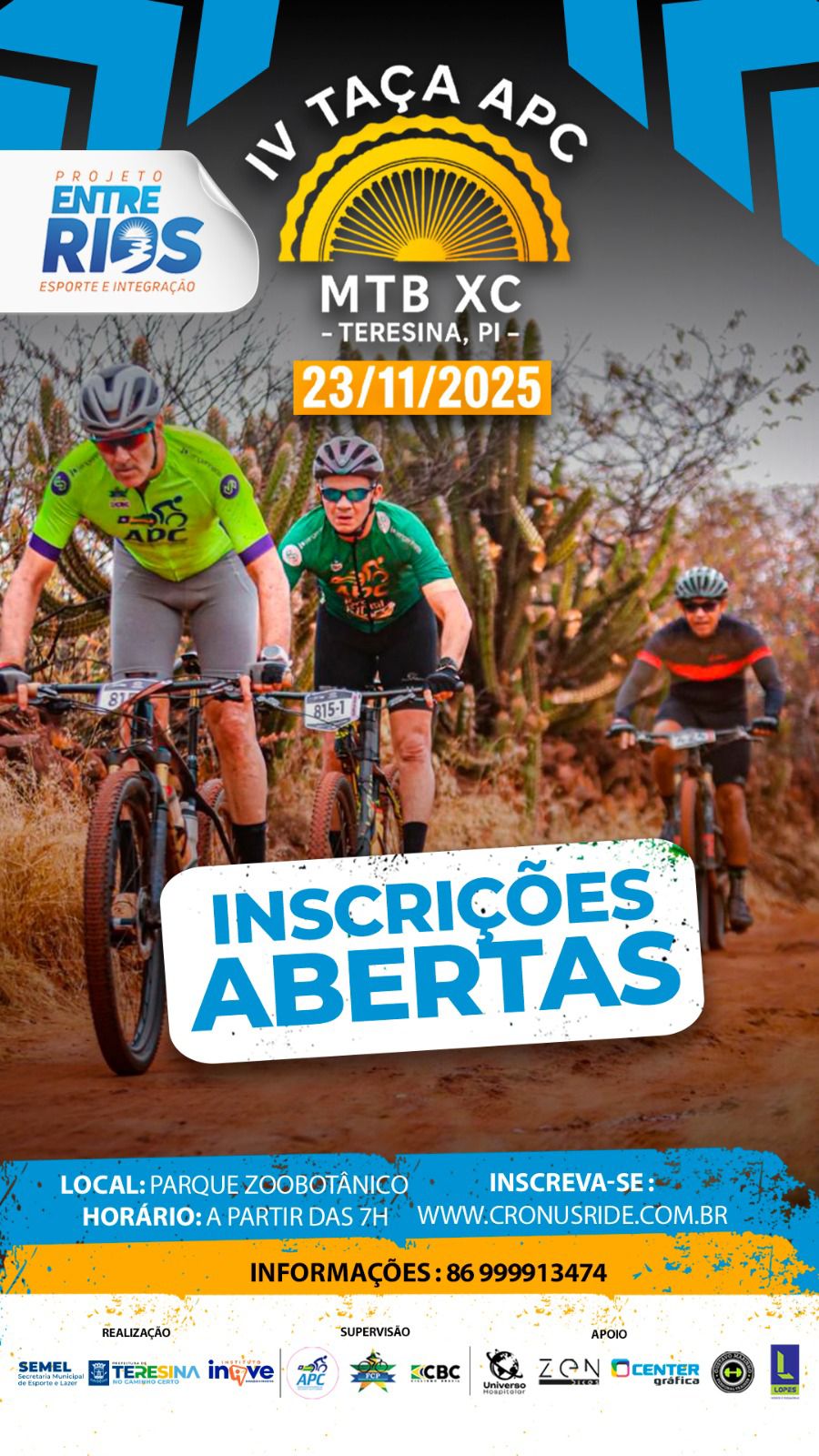 A Associação Piauiense de Ciclismo (APC) abriu inscrições para a IV Taça APC MTB XC, etapa final do campeonato piauiense de mountain bike na modalidade Cross Country (XC). A competição integra o Projeto Entre Rios e será realizada no próximo dia 23 de novembro de 2025, no Parque Zoobotânico, em Teresina.