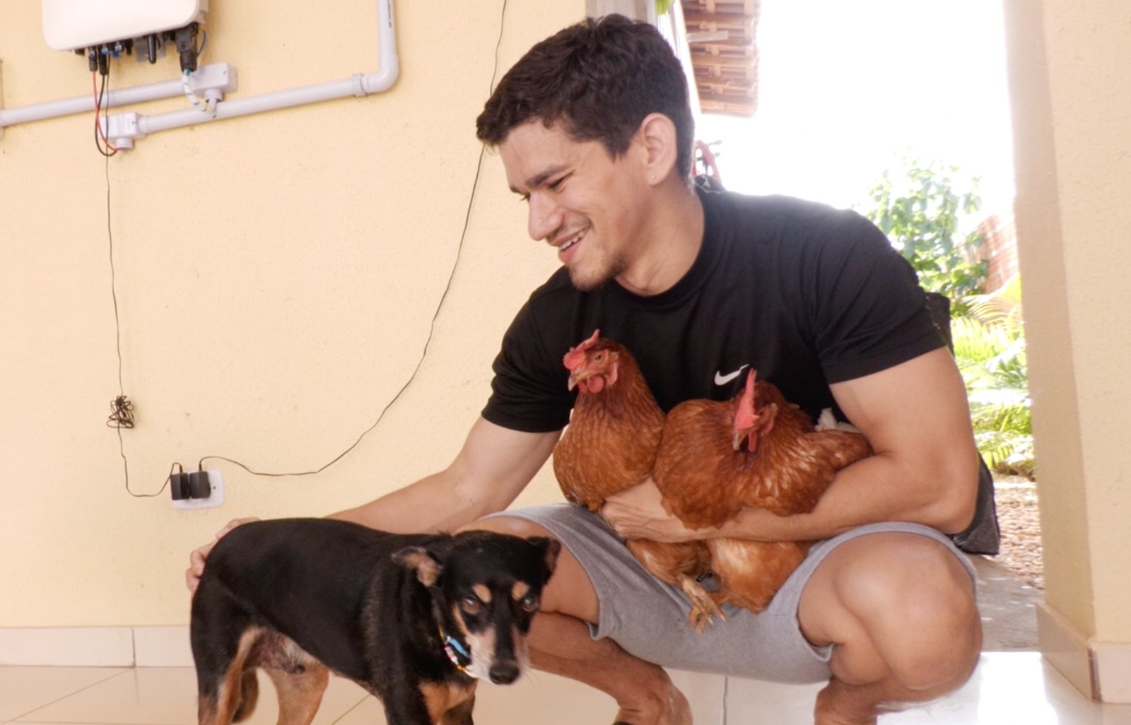 No terreiro, a presença do galo Crispim, o único do grupo, chama atenção. Ele já chegou a ser atacado pelas próprias galinhas com as quais convive, mas segue integrado à rotina da casa, em um ambiente marcado por cuidado e convivência. As galinhas são tratadas como animais domésticos e compartilham não só o espaço, mas também o afeto de Allysson com os “irmãos de quatro patas”, os cães Cisso e Jimmy Hendrix. A relação entre eles é marcada por respeito, tranquilidade e equilíbrio no convívio diário.