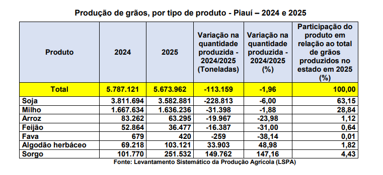 As culturas que mais contribuíram para a queda da produção de grãos do Piaui em 2025 foram a soja, com uma redução de 228,8 mil toneladas (-6%), e o milho, com uma redução de 31,3 mil toneladas (-1,88%).