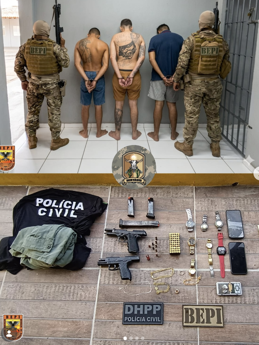 Na operação, também foram apreendidas três pistolas, carregadores municiados e camisas semelhantes às utilizadas pelas polícias Civil e Militar. Conforme a investigação, os suspeitos utilizavam esses materiais para se passar por policiais e facilitar a prática de crimes.