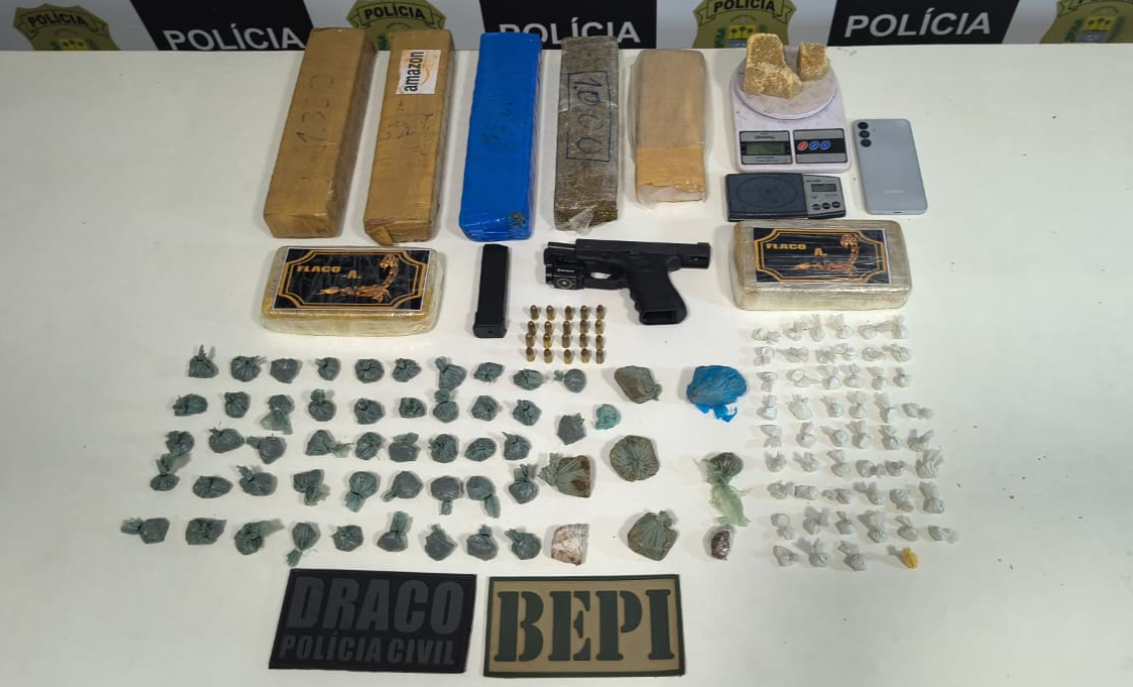 Durante a operação, foram apreendidos entorpecentes como crack e maconha, além de uma pistola Glock equipada com lanterna, considerada de uso restrito. A ação teve como objetivo o cumprimento de mandados judiciais de busca e apreensão e foi fruto de um trabalho de investigação e monitoramento que já vinha sendo desenvolvido há meses pelas forças de segurança.