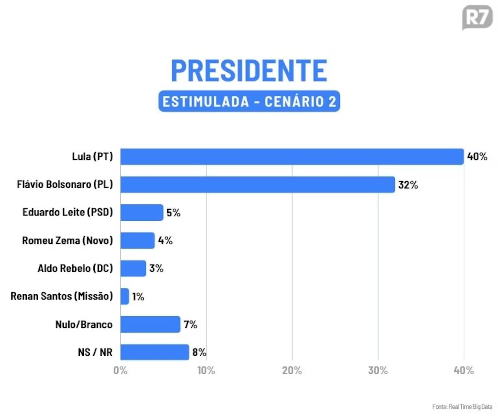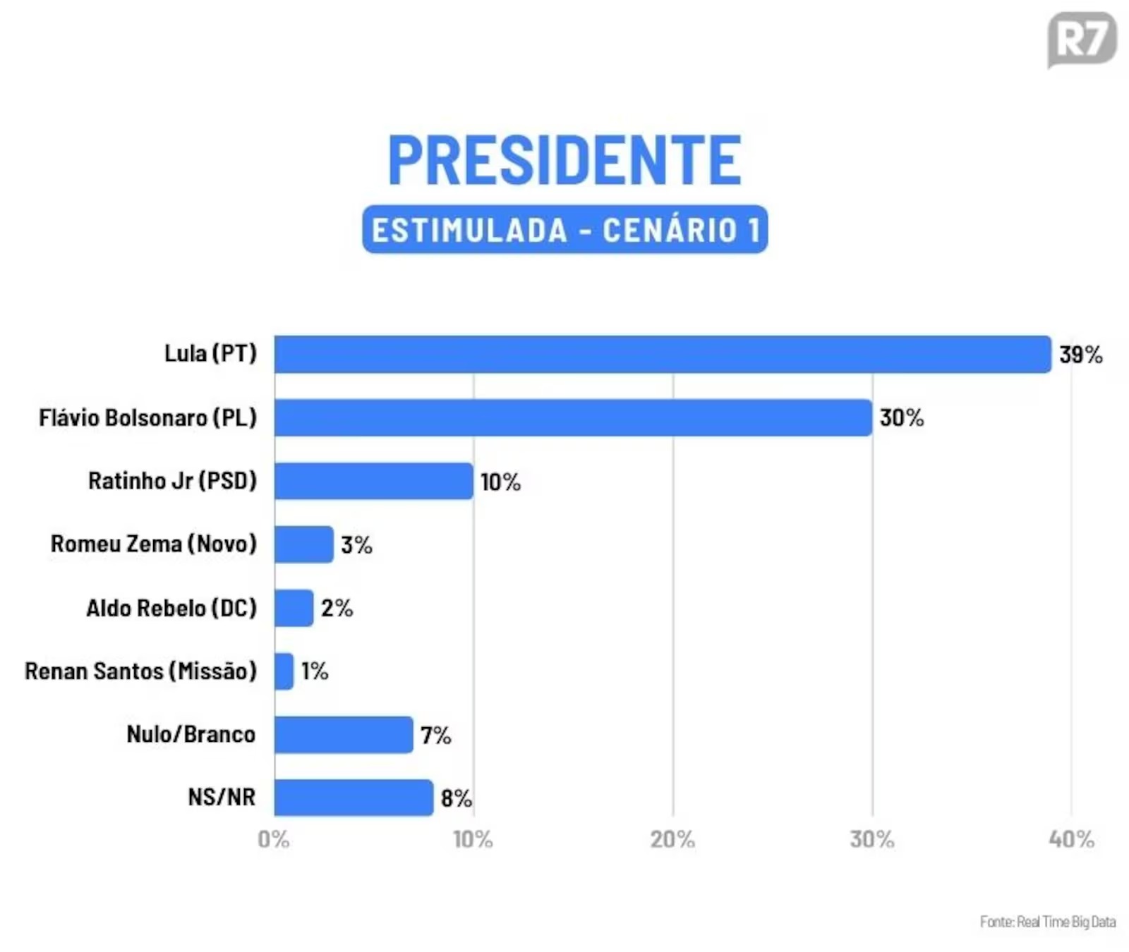 O cenário político brasileiro está dividido entre direita e esquerda neste início de ano eleitoral. Segundo nova pesquisa da Real Time Big Data, divulgada nesta segunda-feira (9), o presidente Luiz Inácio Lula da Silva (PT) e o senador Flávio Bolsonaro (PL) monopolizam a disputa, deixando todos os possíveis candidatos de “terceira via” com menos de 12% das intenções de voto.