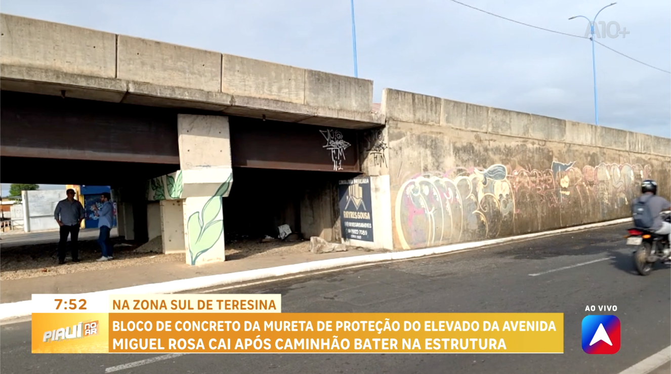 Um bloco de concreto do viaduto da Avenida Miguel Rosa, na zona Sul de Teresina, se desprendeu nesta quarta-feira (17). O presidente do CREA-PI, Hércules Medeiros, detalhou à TV Antena 10 que o bloco caiu após um caminhão bater na estrutura.