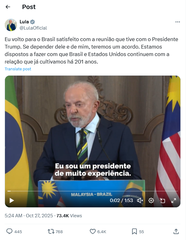 “Eu volto para o Brasil satisfeito com a reunião que tive com o Presidente Trump. Se depender dele e de mim, teremos um acordo. Estamos dispostos a fazer com que Brasil e Estados Unidos continuem com a relação que já cultivamos há 201 anos”, escreveu no X.