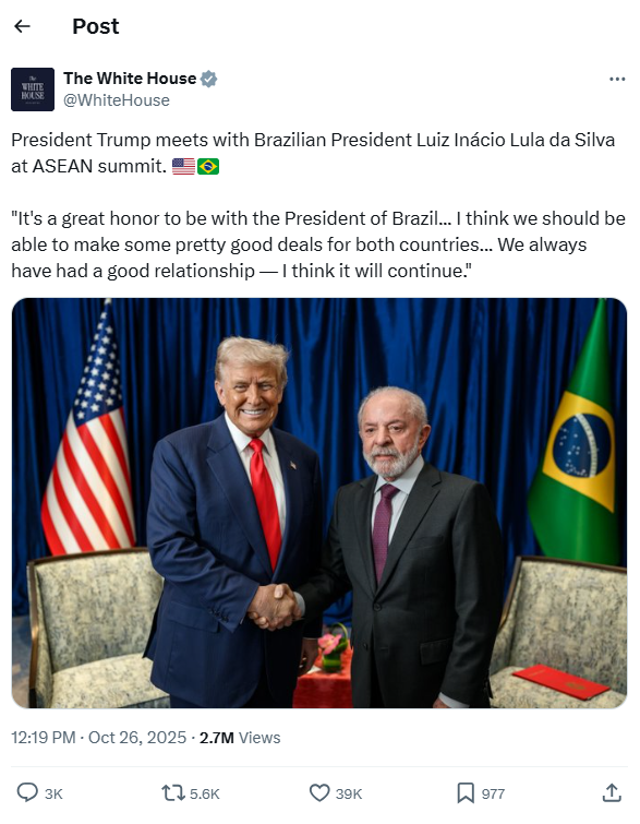 Os presidentes Lula e Donald Trump se reuniram em Kuala Lumpur, na Malásia no último domingo (26). Na manhã desta segunda-feira (27), o presidente brasileiro disse estar confiante de que fará um acordo com os Estados Unidos.