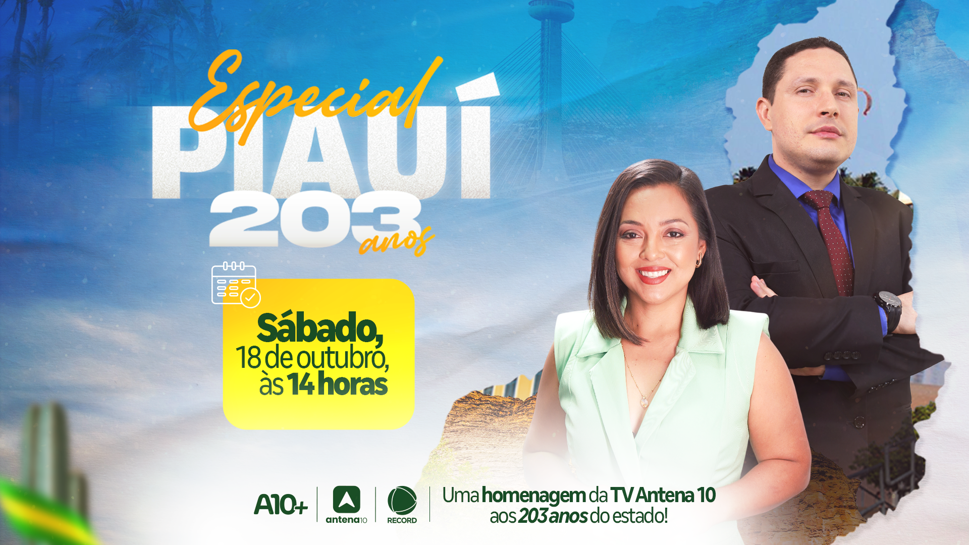 A TV Antena 10, afiliada à RECORD no Piauí, exibe neste sábado (18), o especial “Piauí 203 anos” a partir das 14 horas sob o comando dos jornalistas Sayuri Sato e Eliézer Rodrigues. A atração reunirá reportagens especiais, convidados e muito mais.