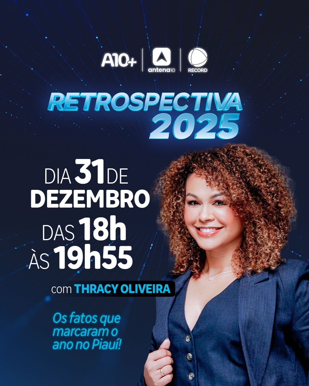 A TV Antena 10, afiliada à RECORD no Piauí, exibe nesta quarta-feira (31) a "Retrospectiva 2025", programa especial que reúne os fatos mais marcantes que impactaram o estado do Piauí ao longo do ano. O especial, comandado pela jornalista Thracy Oliveira, será transmitido das 18h às 19h55.