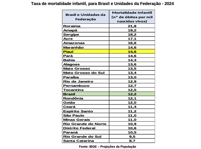 O Piauí registrou em 2024 uma taxa de mortalidade infantil, de crianças menores de 1 ano, de 14,6 óbitos por mil nascidos vivos, o sétimo maior índice do país e o quarto mais elevado do Nordeste. O número é superior ao verificado tanto na média nordestina (13,4) quanto na média brasileira (12,2).