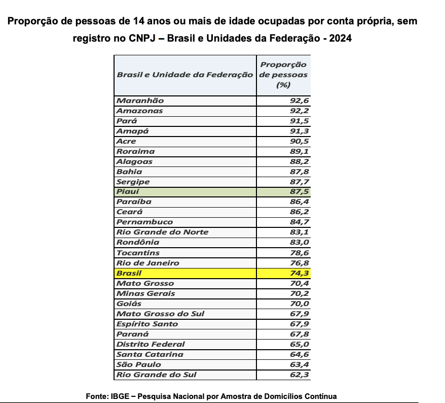 O levantamento mostra que, das 382 mil pessoas de 14 anos ou mais ocupadas por conta própria no estado, 334 mil trabalhavam de forma informal. Apenas 48 mil trabalhadores (12,5%) tinham registro formal como pessoa jurídica. A taxa registrada no Piauí supera com folga a média nacional. No Brasil, 74,3% dos trabalhadores por conta própria não possuem CNPJ, uma diferença de 13,2 pontos percentuais a menos que o índice piauiense.