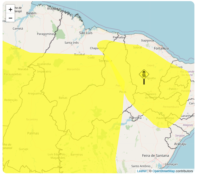 O aviso meteorológico indica possibilidade de chuva entre 20 e 30 mm por hora, ou até 50 mm no dia, com ventos que podem chegar a 60 km/h. Apesar disso, o risco de danos como queda de árvores, cortes de energia, alagamentos e descargas elétricas é considerado baixo.