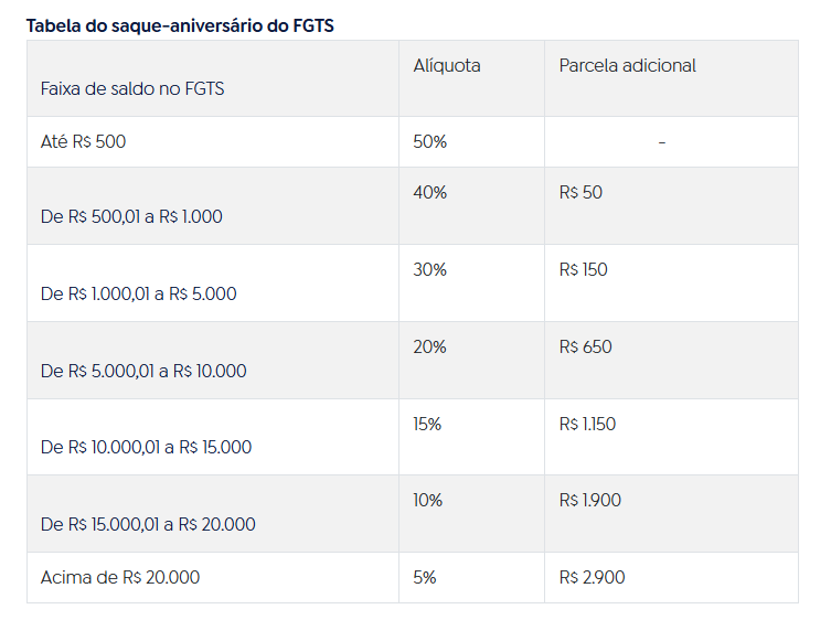 O valor depende do saldo total nas contas do FGTS e segue uma tabela progressiva. A alíquota varia de 5% a 50%, com uma parcela adicional fixa.