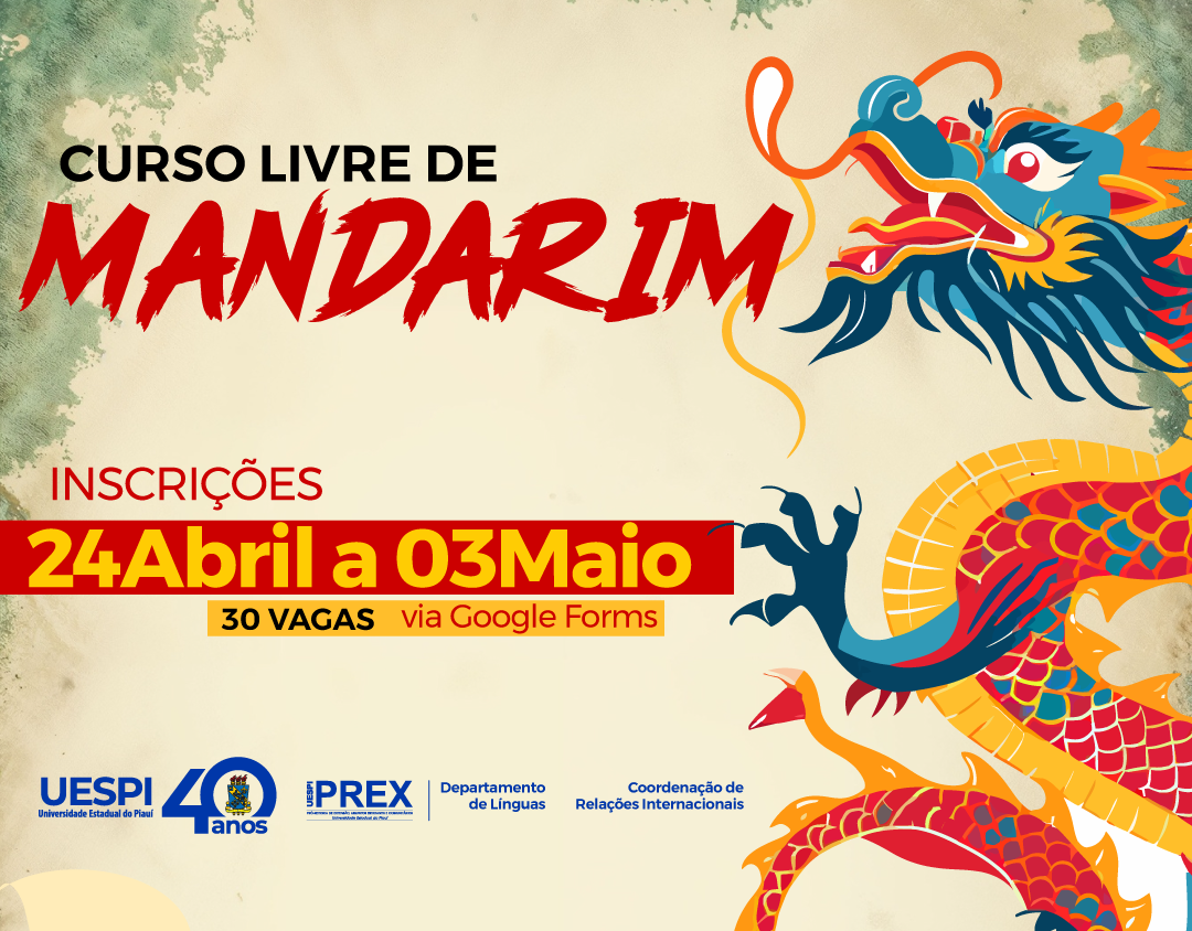 A Universidade Estadual do Piauí (Uespi) abriu inscrições para o curso livre de mandarim, promovido pela Coordenação de Relações Internacionais (CRI) e pelo Departamento de Línguas (DL/PREX), em parceria com a Universidade Normal de Fujian, localizada em Fuzhou, na China. A iniciativa é voltada à comunidade acadêmica da instituição e oferece 30 vagas para aulas na modalidade online.