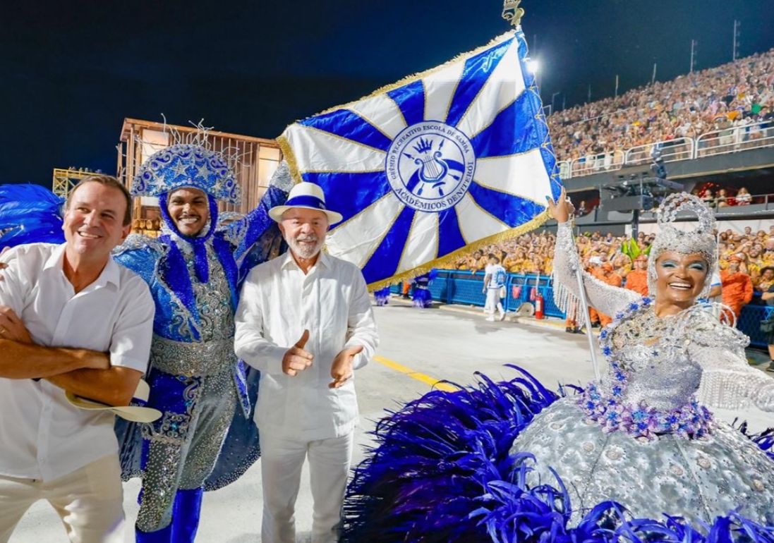 Lula acompanhou o desfile de um camarote na Sapucaí, ao lado de autoridades como o prefeito do Rio de Janeiro, Eduardo Paes (PSD), e desceu à avenida para cumprimentar integrantes da escola, incluindo o casal de mestre-sala e porta-bandeira.