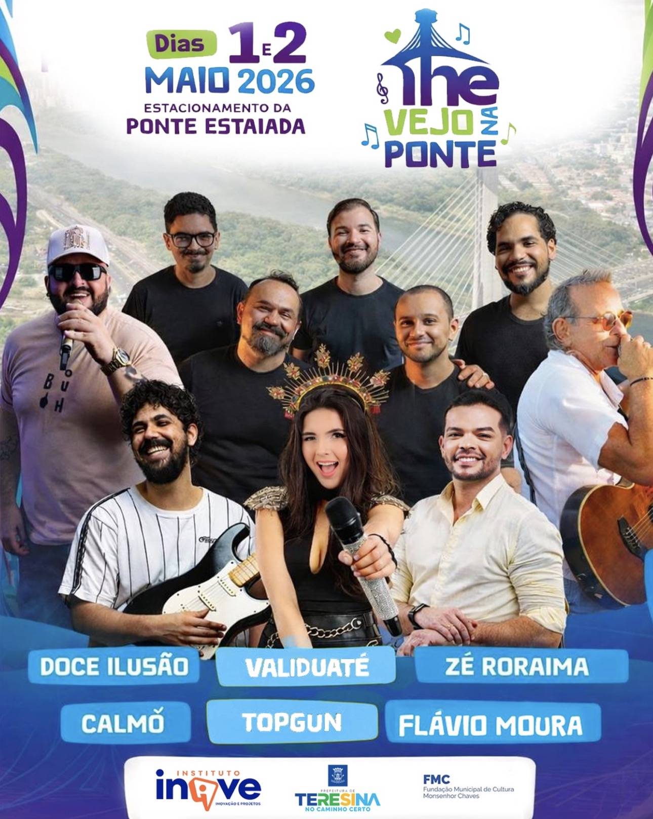 A programação oficial do festival The Vejo na Ponte foi divulgada e promete movimentar a cena cultural de Teresina nos dias 1º e 2 de maio de 2026. O evento será realizado no estacionamento da Ponte Estaiada, um dos principais cartões-postais da capital, e terá entrada gratuita.