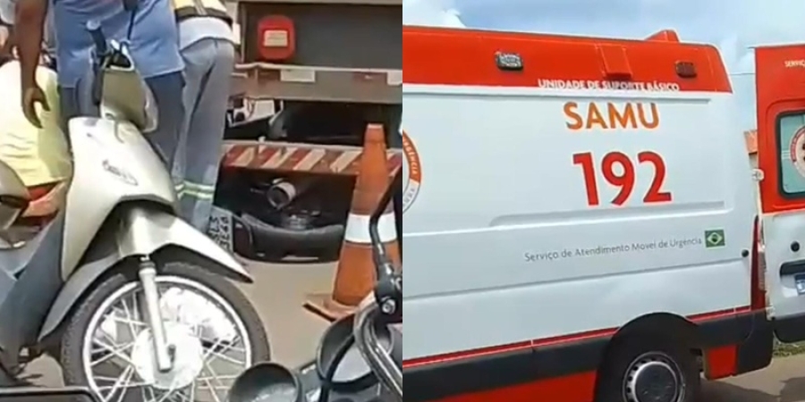 Com o impacto, o homem caiu no asfalto e a motocicleta foi parar embaixo do caminhão. O motociclista estava consciente e reclamava de muitas dores.
