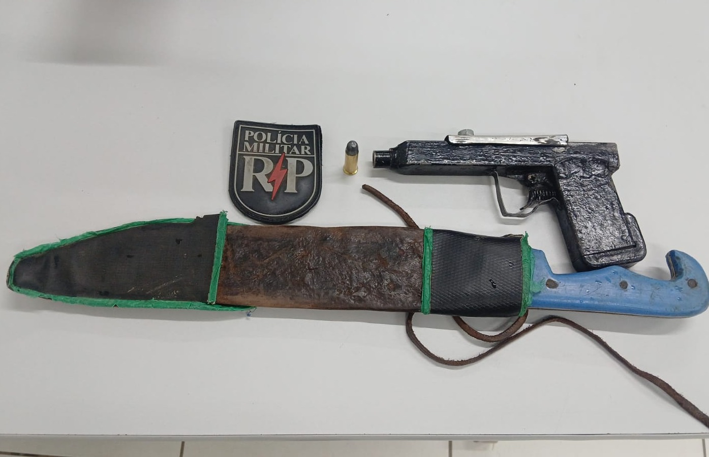 Durante buscas na residência, a guarnição encontrou uma arma de fabricação caseira calibre .38, municiada, além de um facão. Apesar da gravidade da situação, a vítima não apresentava lesões aparentes e manifestou interesse em representar criminalmente contra o agressor.