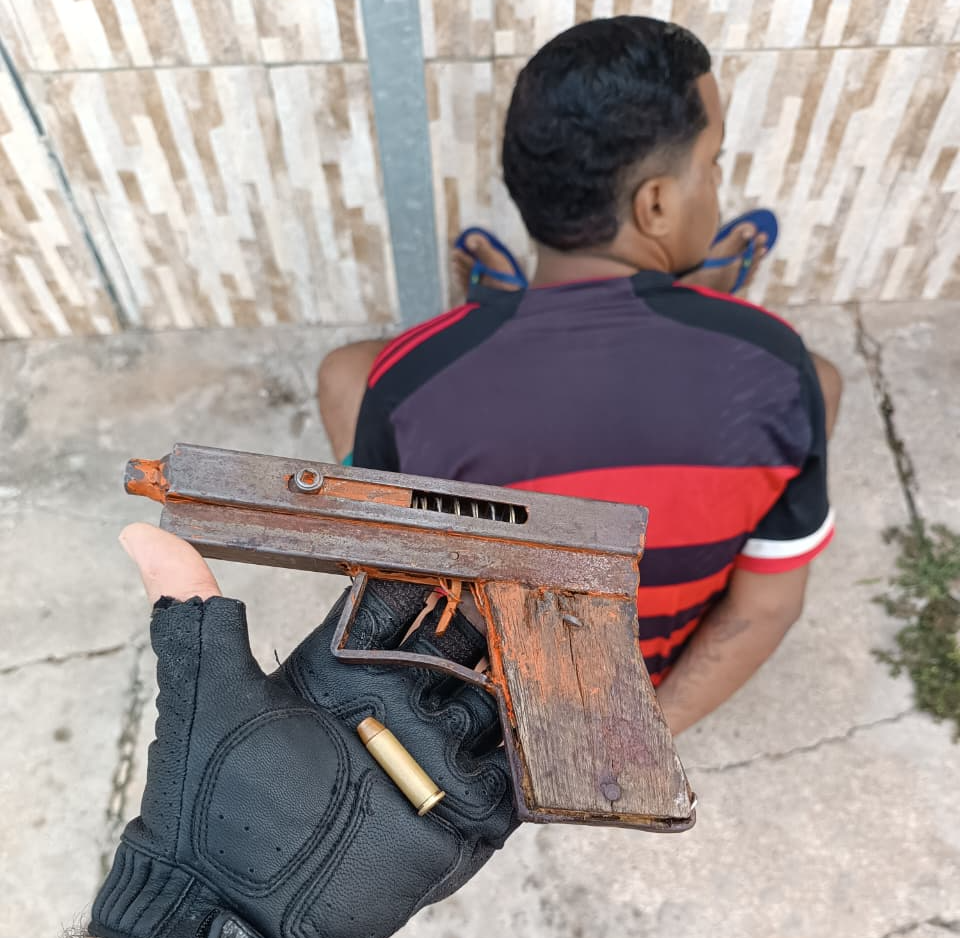 De acordo com a PM, os policiais avistaram o suspeito em atitude considerada suspeita e, ao perceber a aproximação da guarnição, ele tentou se desfazer de uma arma de fogo do tipo “calça-bala”, que estava municiada com uma munição calibre .38.