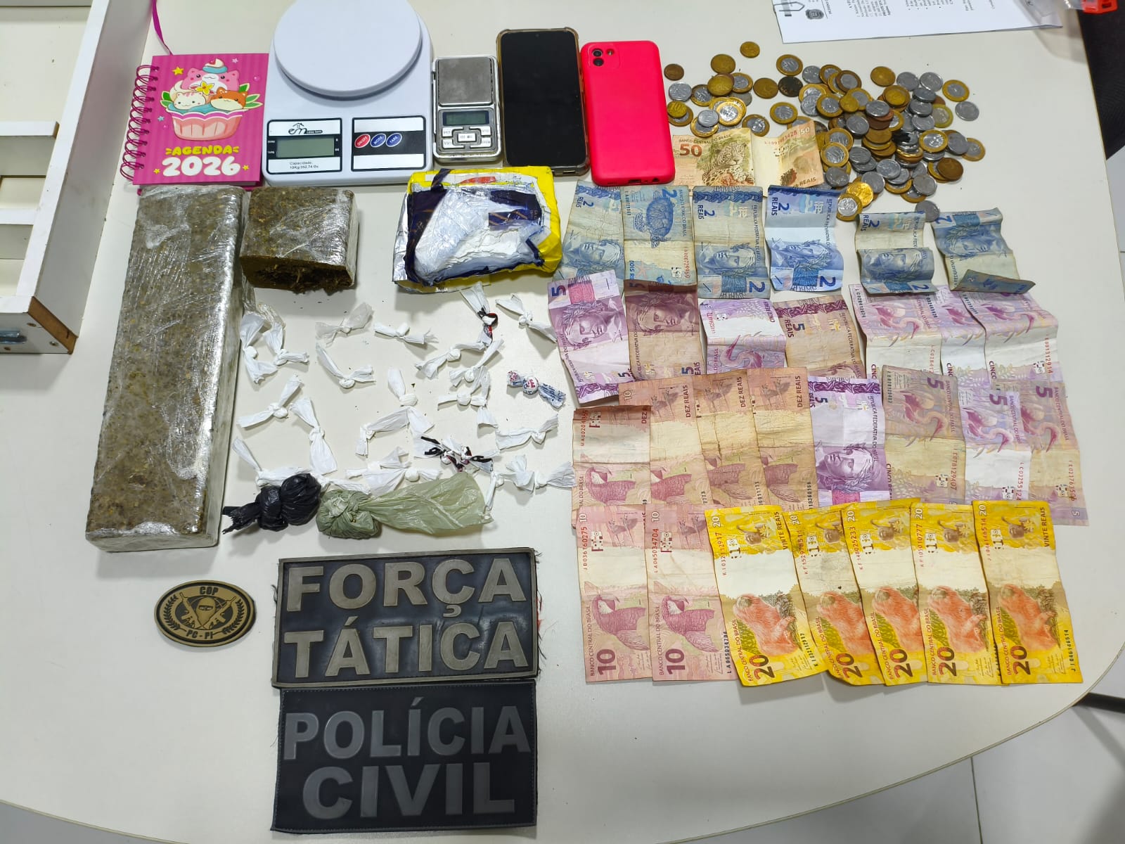 Com a porta da casa aberta, a equipe visualizou embalagens plásticas semelhantes a “trouxinhas” sobre o braço de um sofá. "Diante dos indícios de tráfico, crime de natureza permanente, os policiais entraram na residência, onde encontraram porções de cocaína prontas para comercialização, além de outras quantidades da droga no quarto do casal, dinheiro trocado, duas porções de maconha, duas balanças de precisão, uma faca utilizada para fracionar os entorpecentes e um caderno com anotações relacionadas à venda de drogas", destacou a PM.