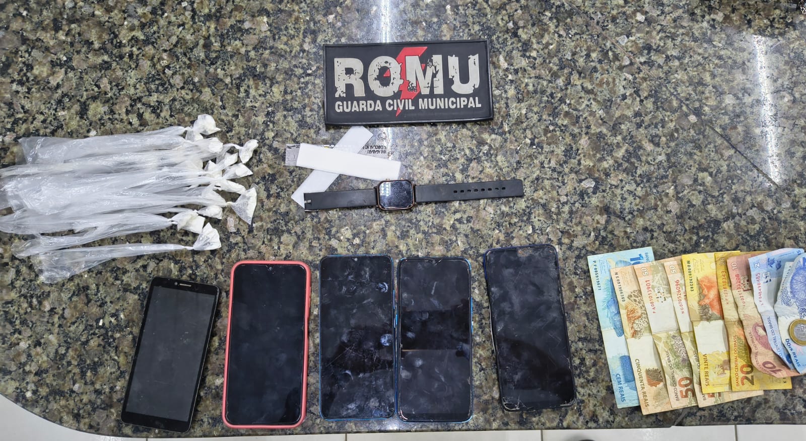 No interior do imóvel, estavam dois menores de idade. Com eles, foram encontrados mais invólucros da droga, além de cinco aparelhos celulares, um smartwatch e a quantia de R$ 305 em dinheiro. Um dos celulares possuía restrição por roubo ou furto.