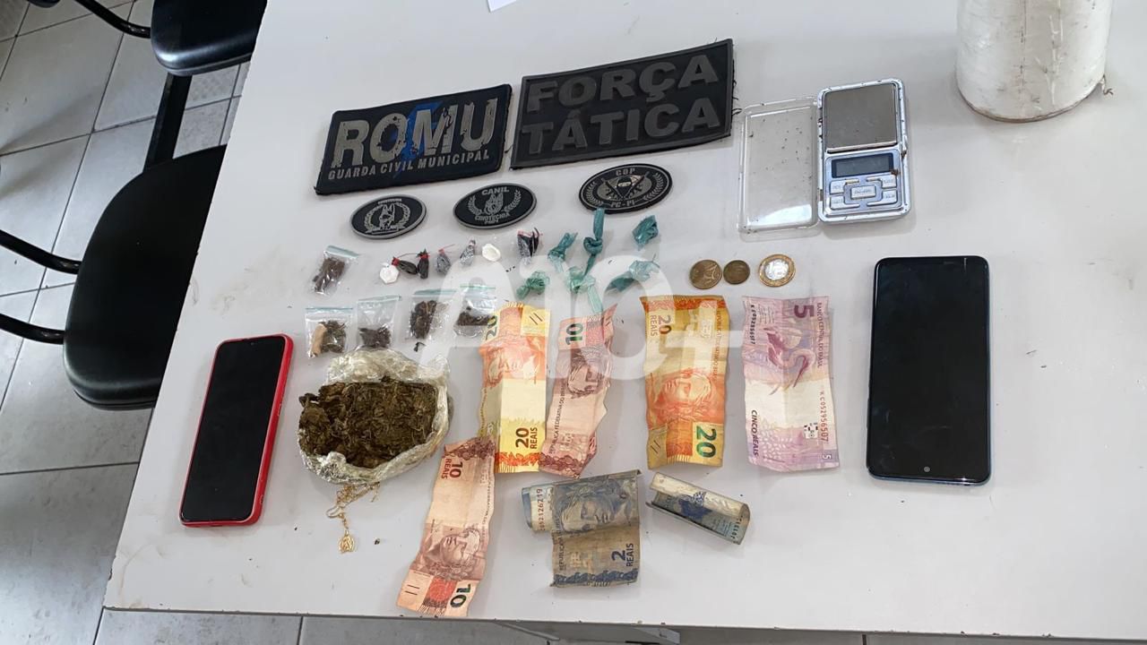 Ao chegar ao endereço, os militares avistaram dois suspeitos em atitude considerada suspeita. Um deles entregou uma bolsa ao comparsa, que tentou fugir, mas acabou detido pela equipe. Durante a revista pessoal, os policiais apreenderam drogas e dinheiro fracionado. O abordado ainda revelou que havia mais entorpecentes enterrados nas proximidades.