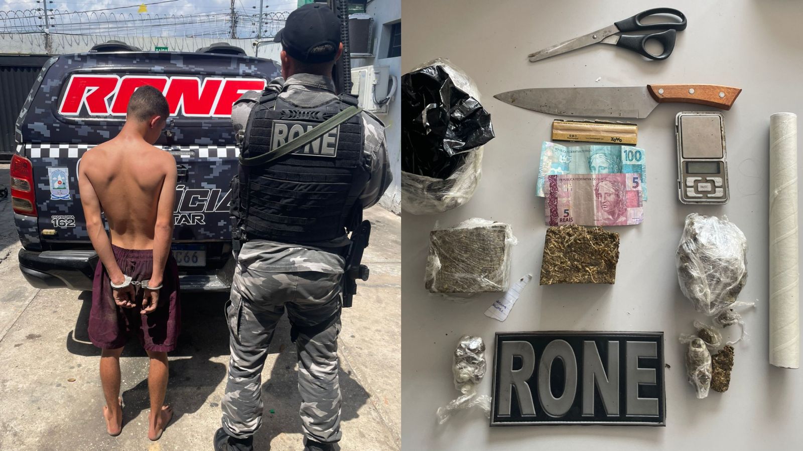 Durante a abordagem, o suspeito informou que havia maconha guardada dentro da geladeira do imóvel. No local, os militares apreenderam nove porções de maconha em tamanhos variados, além de uma balança de precisão, papel filme, uma tesoura, uma faca e R$ 105,50 em dinheiro, materiais comumente utilizados no preparo e na comercialização de drogas.