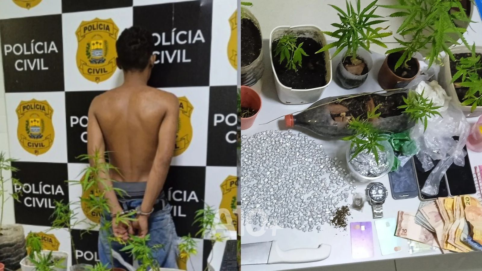 Com as informações, as equipes iniciaram diligências e conseguiram localizar o homem, que atuava no tráfico no próprio endereço onde morava. No local, os agentes encontraram mais de 770 trouxinhas de substância análoga a entorpecentes prontas para venda, além de pés de maconha, celulares e um caderno com anotações do tráfico.