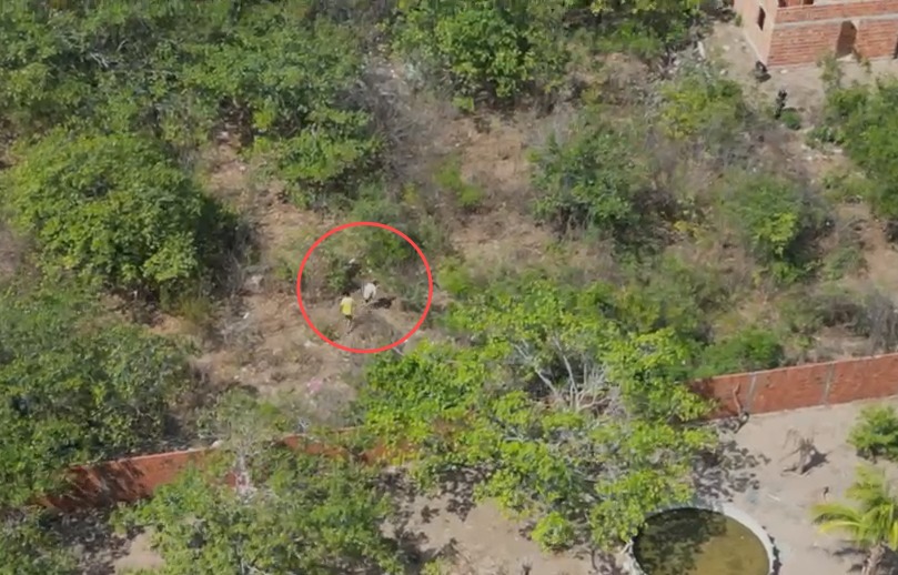Horas depois, durante a abordagem policial, três suspeitos fugiram pela mata. A fuga foi registrada por imagens aéreas feitas com o auxílio de um drone. Durante a corrida, os homens dispensaram drogas e uma pistola.