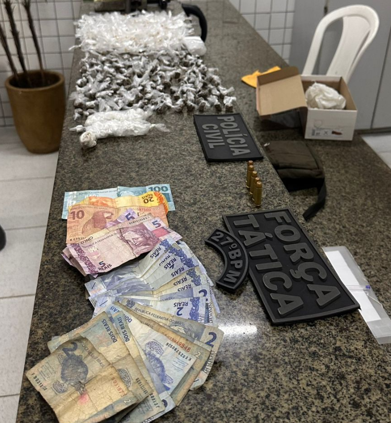 Na sequência da operação, o carro vermelho foi localizado estacionado em uma rua próxima. O motorista foi abordado e entregou voluntariamente uma porção de droga encontrada dentro do veículo, além de informar o endereço de sua residência. No imóvel, a polícia apreendeu mais drogas e um revólver calibre .38.