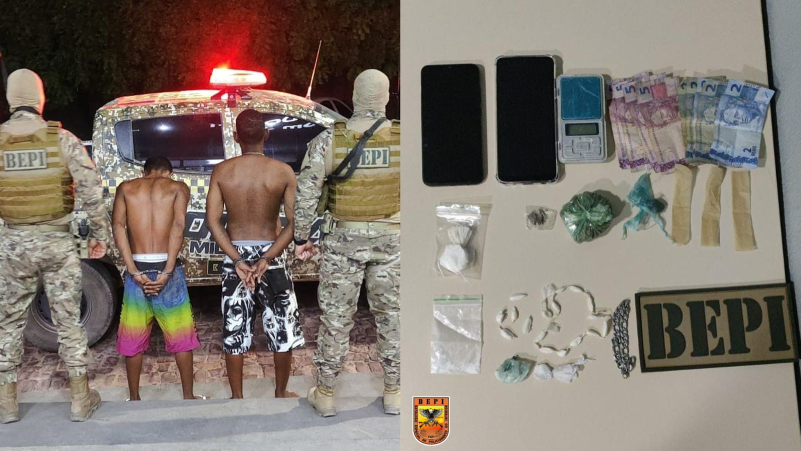 A Polícia Militar do Piauí prendeu dois homens de 20 e 24 anos, identificados pelas iniciais P.R.M.R., e R.F.R.S., respectivamente, suspeitos de comercializar entorpecentes na cidade de Bom Jesus, no Sul do Piauí.