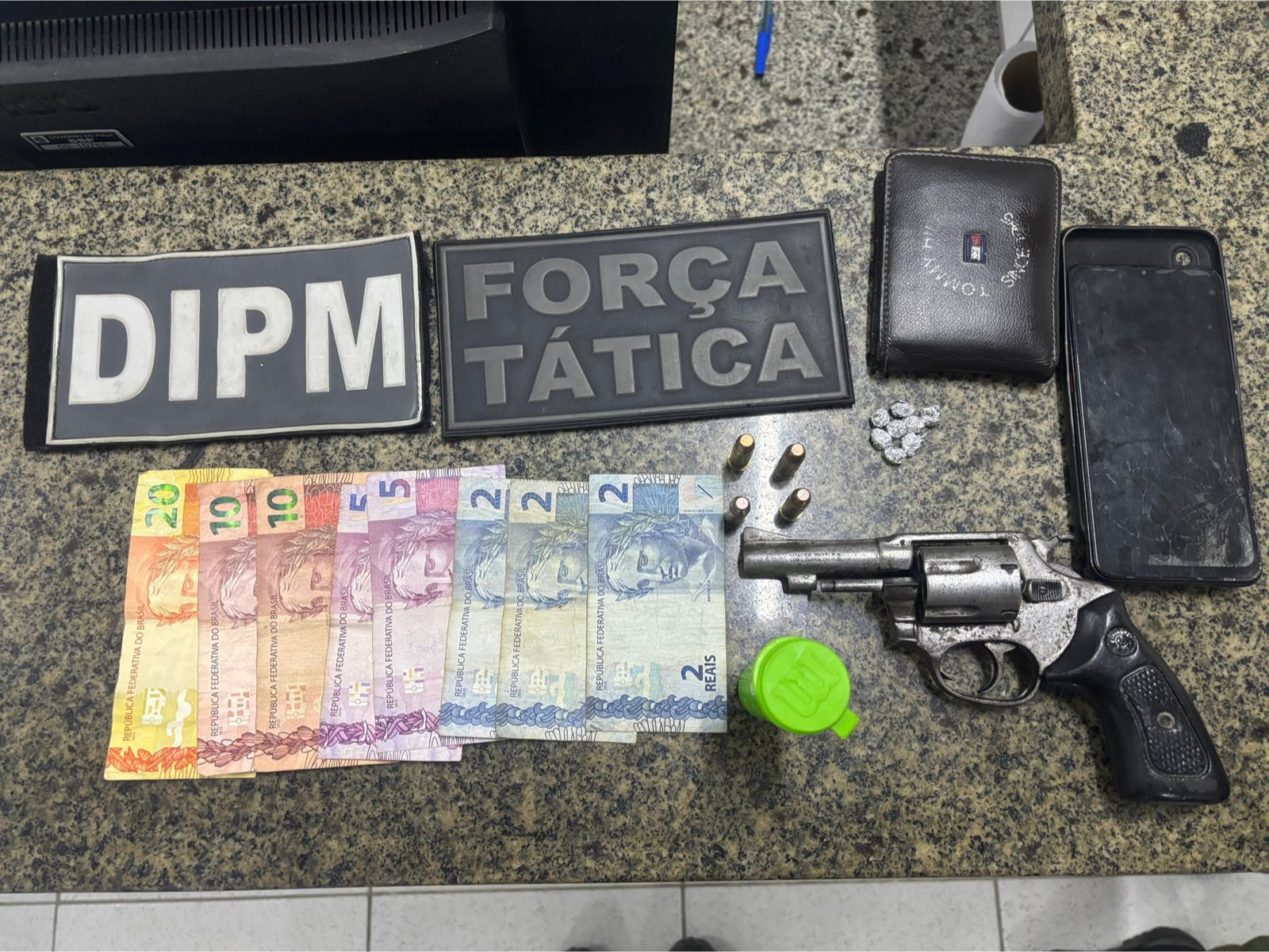 Durante abordagem a polícia encontrou com o condutor um revólver calibre .38 com quatro munições intactas, oito porções de substância análoga a crack, um celular e R$ 56 em espécie. Na garupa a passageira era companheira do suspeito.