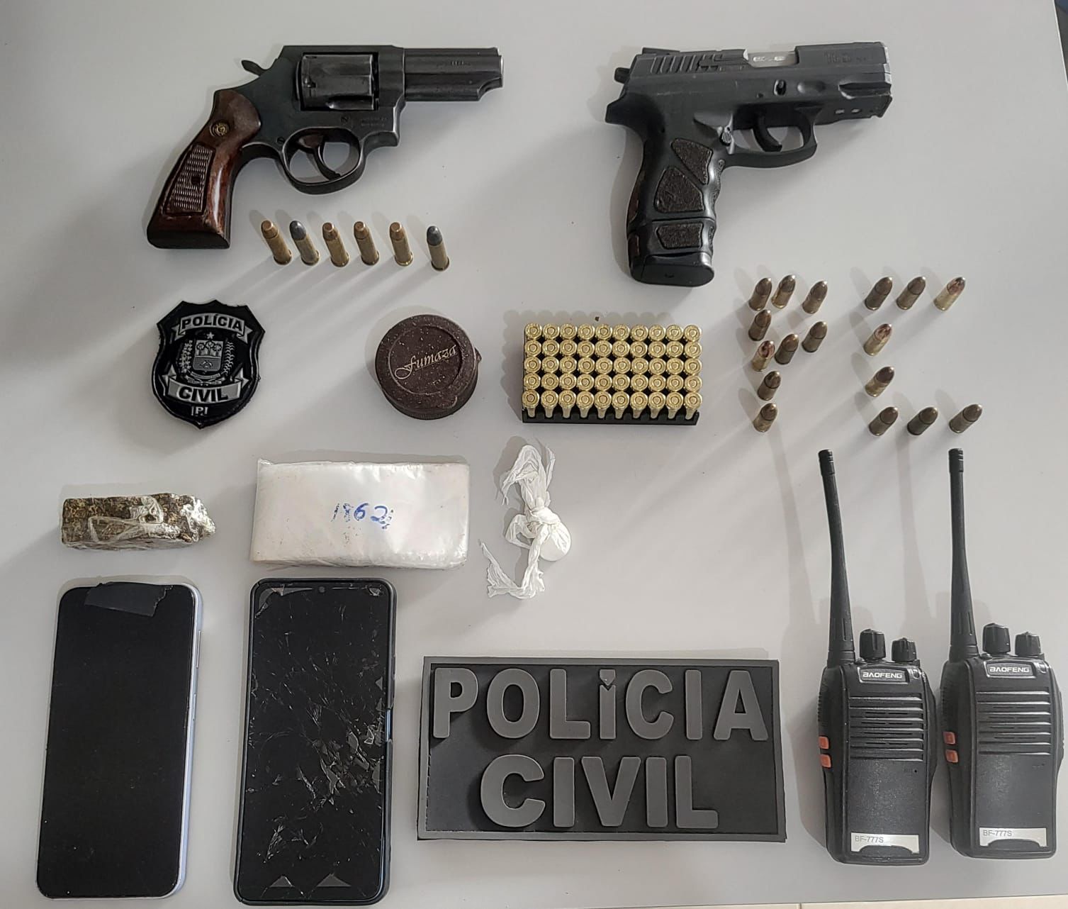 No local da operação, os policiais apreenderam uma arma de fogo calibre 9mm com numeração suprimida, um revólver calibre .38, munições, entorpecentes, rádios comunicadores, aparelhos celulares e veículos com indícios de adulteração, além de outros objetos utilizados em atividades criminosas.