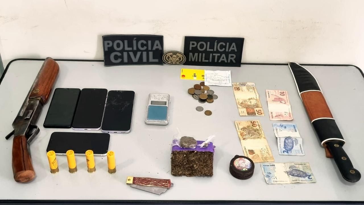 As prisões ocorreram durante o cumprimento de mandado de busca e apreensão na residência de A.M.D.S. No imóvel, os policiais encontraram porções de maconha, uma balança de precisão, dinheiro fracionado e uma arma de fogo.