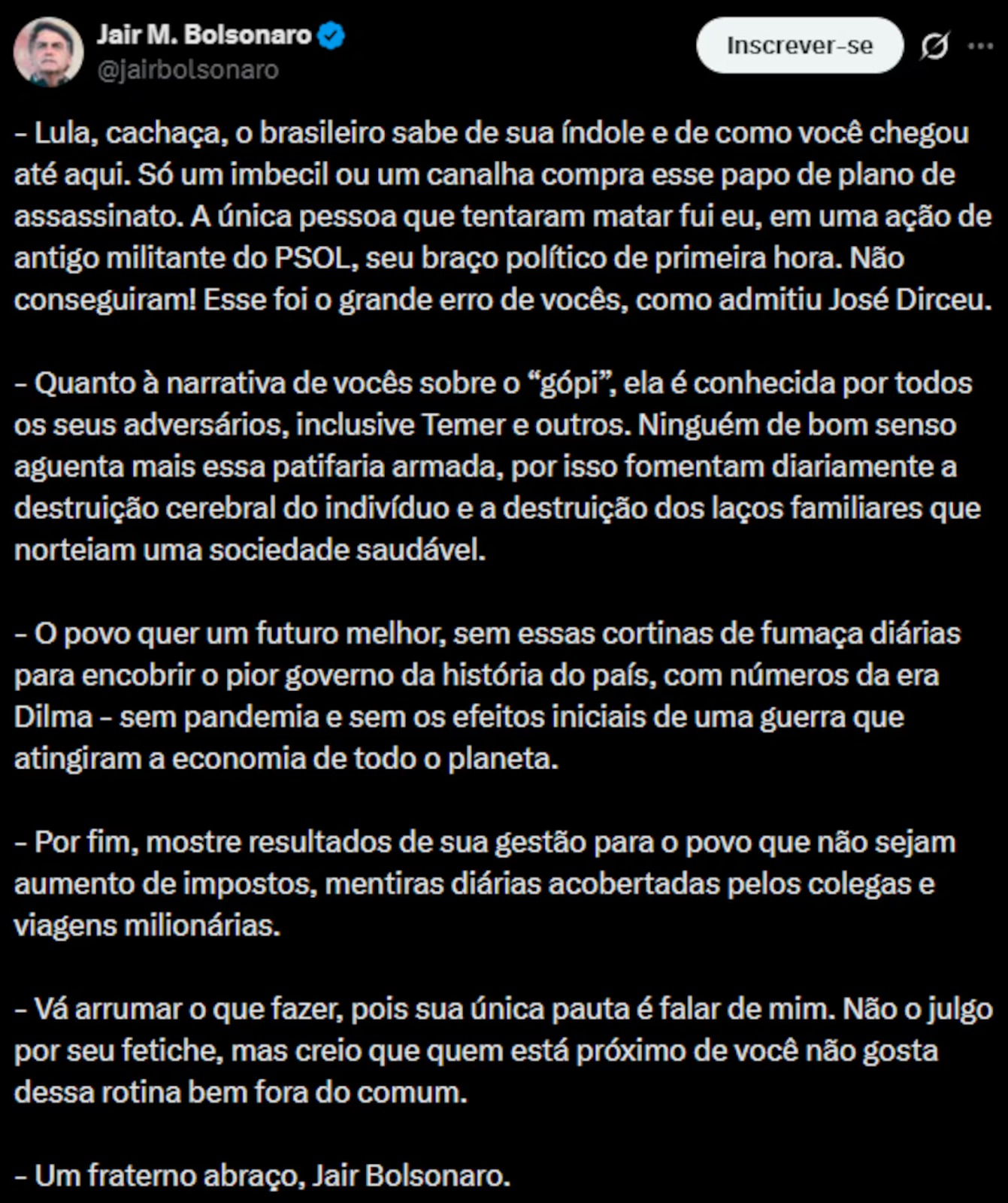 Em outra publicação, ao reagir a uma fala do presidente sobre ter idealizado um golpe de Estado após o pleito de 2022 e um plano para assassinar autoridades, Bolsonaro negou as acusações e chamou Lula de “cachaça”.