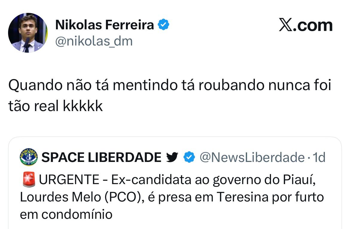 O deputado federal Nikolas Ferreira (PL) usou as redes sociais neste sábado (04) e atacou a professora Lourdes Melo, que já foi candidata à Prefeitura de Teresina e ao Governo do Piauí. Ele compartilhou um post que falava que a professora foi presa, em tom de ironia.