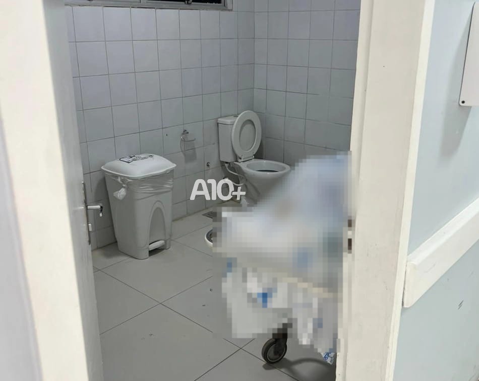 Na imagem, é possível visualizar o corpo coberto e por cima de uma maca. Ao lado, havia uma lixeira e o vaso sanitário.