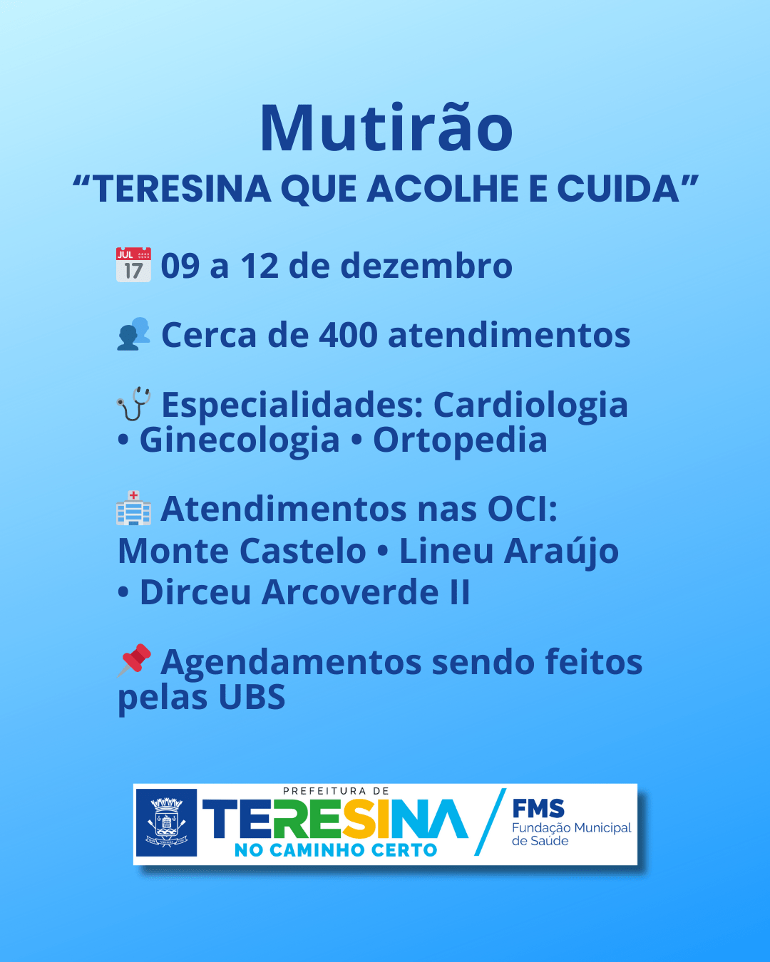A Fundação Municipal de Saúde (FMS), iniciou o processo de agendamento, por meio das Unidades Básicas de Saúde (UBS), os atendimentos do mutirão “Teresina que Acolhe e Cuida”, uma iniciativa voltada para ampliar o acesso a consultas e exames especializados nas áreas de Cardiologia, Ginecologia e Ortopedia.