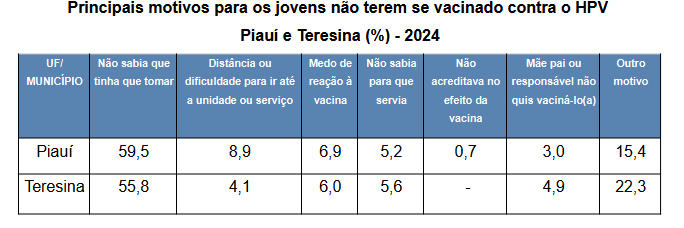 Na capital, Teresina, o cenário também chama atenção; entre os jovens que não receberam a vacina, 55,8% declararam desconhecer a necessidade da imunização. Esse percentual coloca a cidade acima da média brasileira, com uma diferença de 6,2 pontos percentuais.
